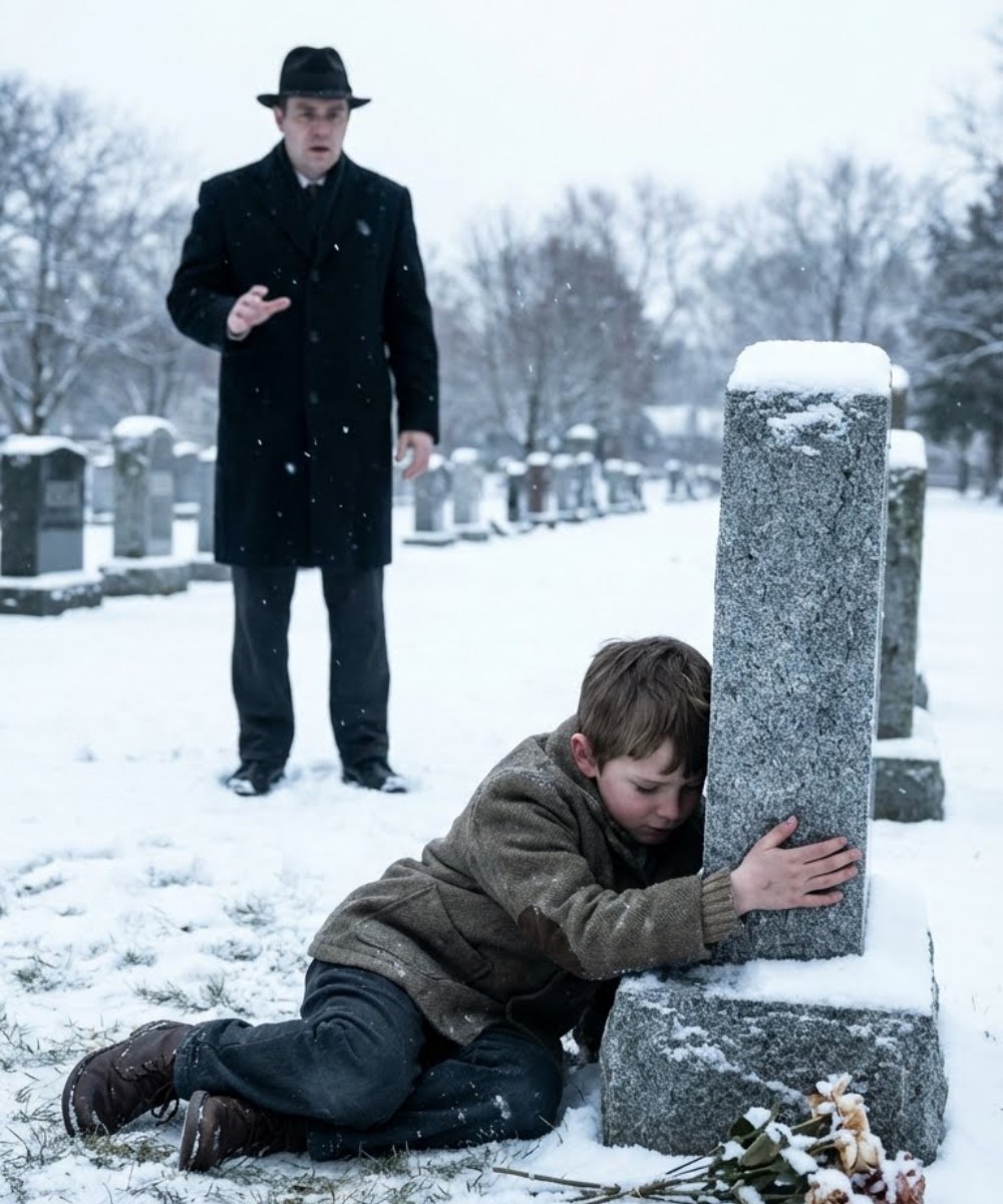 Near the headstone lay a small plaid blanket, dusted with fresh snow. Beside it sat a child—curled inward, as if trying to disappear. Mud-stained gloves. Red, swollen eyes. In his hands, a black-and-white photograph, frayed at the edges from being held too tightly, too often.
