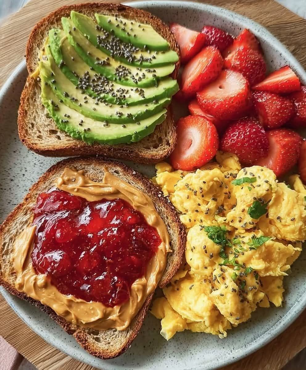 Balanced Breakfast Plate β a colorful, nutrient-packed way to start your morning! Featuring creamy avocado toast, a classic peanut butter and jelly toast, fluffy scrambled eggs, and juicy strawberries, this breakfast is perfectly balanced with protein, healthy fats, and natural sweetness. π₯π₯πβ