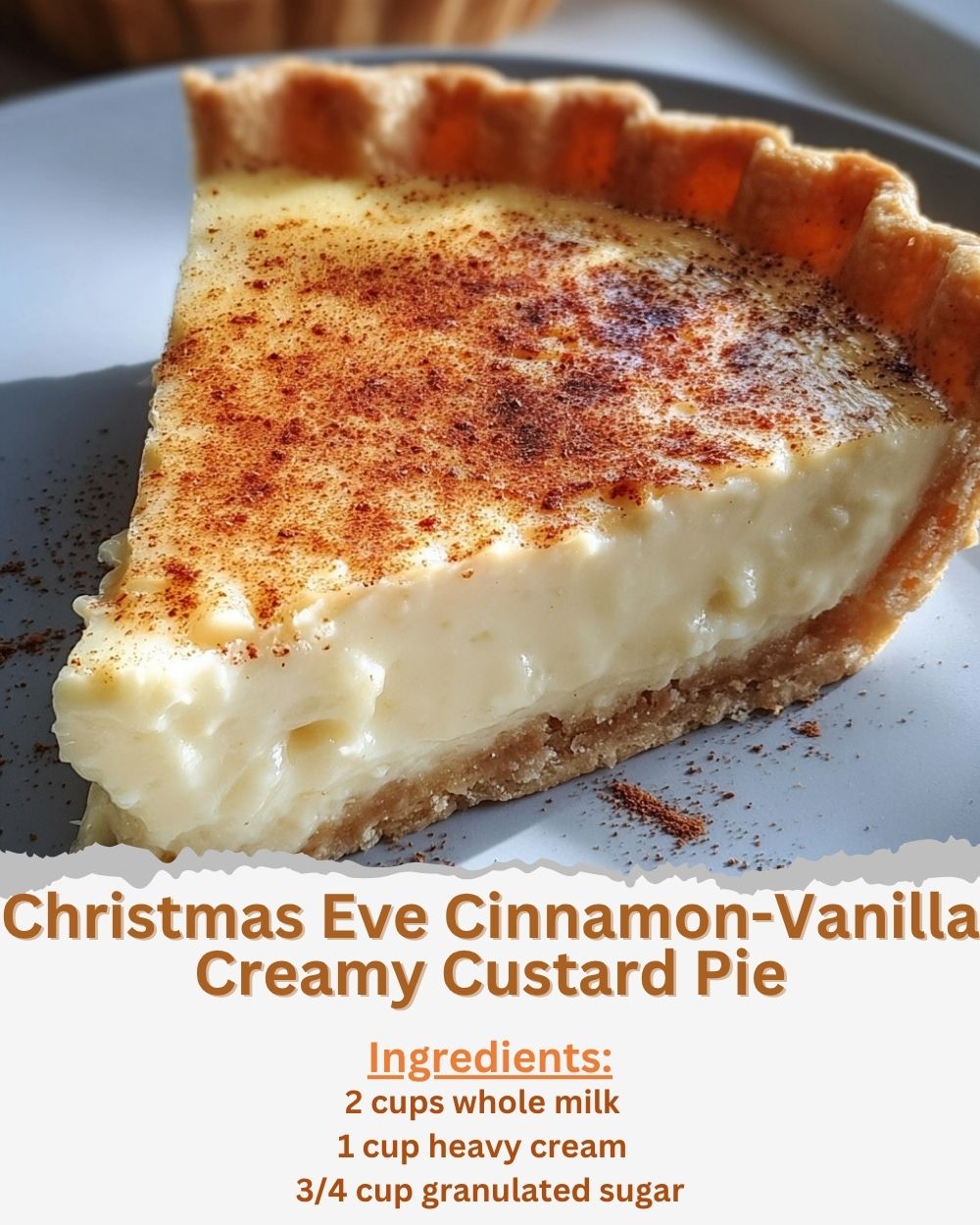 This Christmas Eve Cinnamon-Vanilla Creamy Custard Pie is the perfect dessert to add a cozy, festive touch to your holiday table. With its rich, smooth custard filling infused with vanilla, cinnamon, and nutmeg, all nestled in a buttery pie crust, this dessert is sure to become a family favorite. The velvety custard, paired with the warm spices, creates a comforting and indulgent treat that’s perfect for holiday gatherings. Whether served as the grand finale of your Christmas Eve dinner or as a sweet snack during the holiday season, this custard pie delivers a perfect balance of flavors.