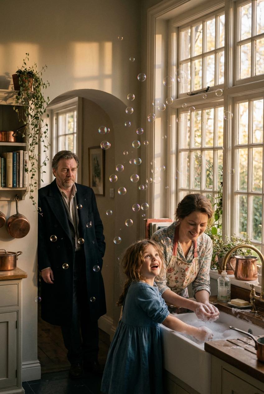 Her small hands were submerged in foam, splashing water everywhere as bubbles drifted through the air like tiny floating planets. Beside her stood Harper Lane, the recently hired household assistant—a young woman Nathan barely remembered interviewing because grief made everything blur.