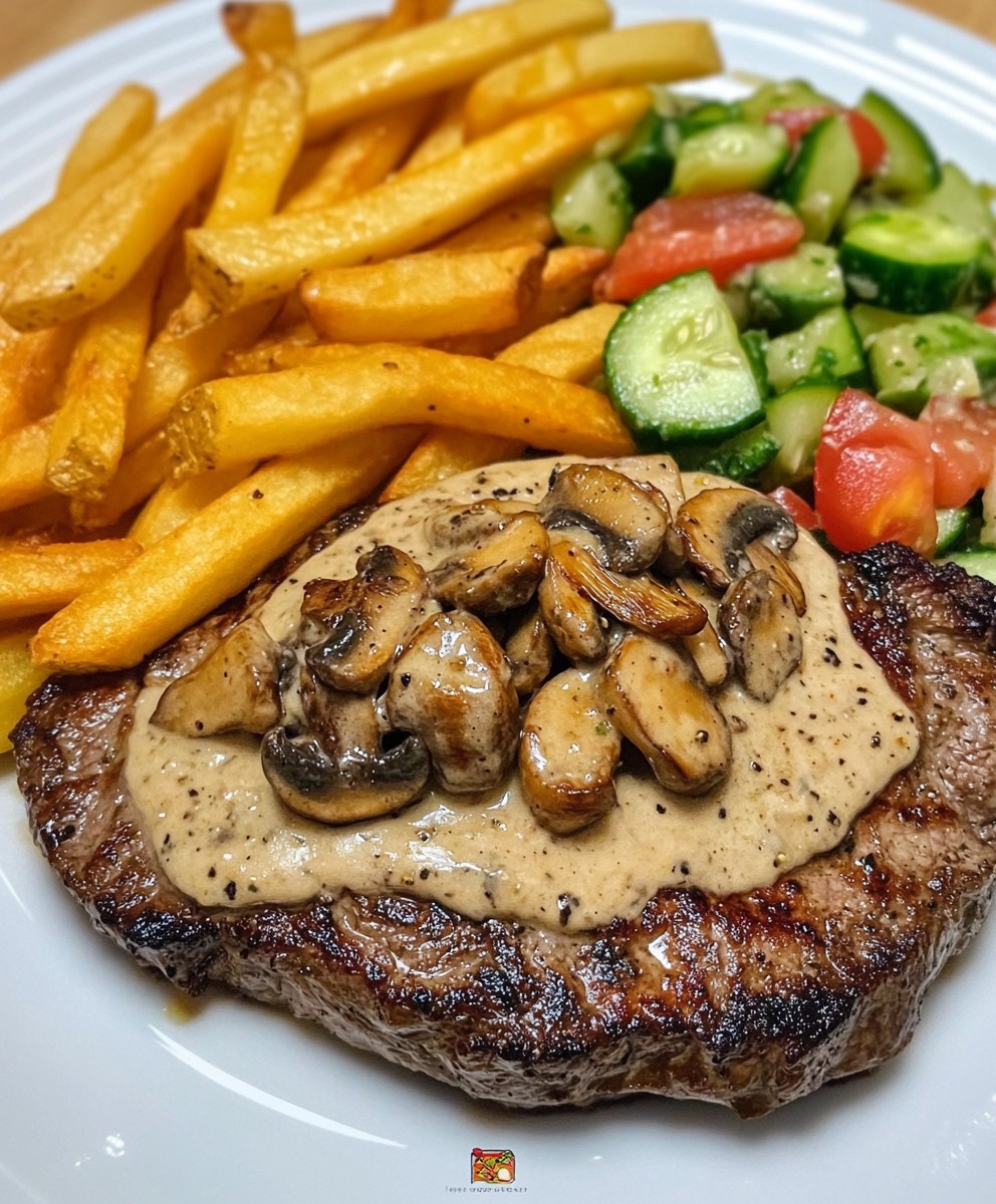 This comforting, restaurant-style meal features a juicy pan-seared steak topped with rich, creamy mushroom sauce (no bacon needed!), served with golden homemade fries and a refreshing cucumber–tomato salad. A satisfying, well-balanced plate with bold flavors and classic textures—perfect for cozy dinners or indulgent weekends!