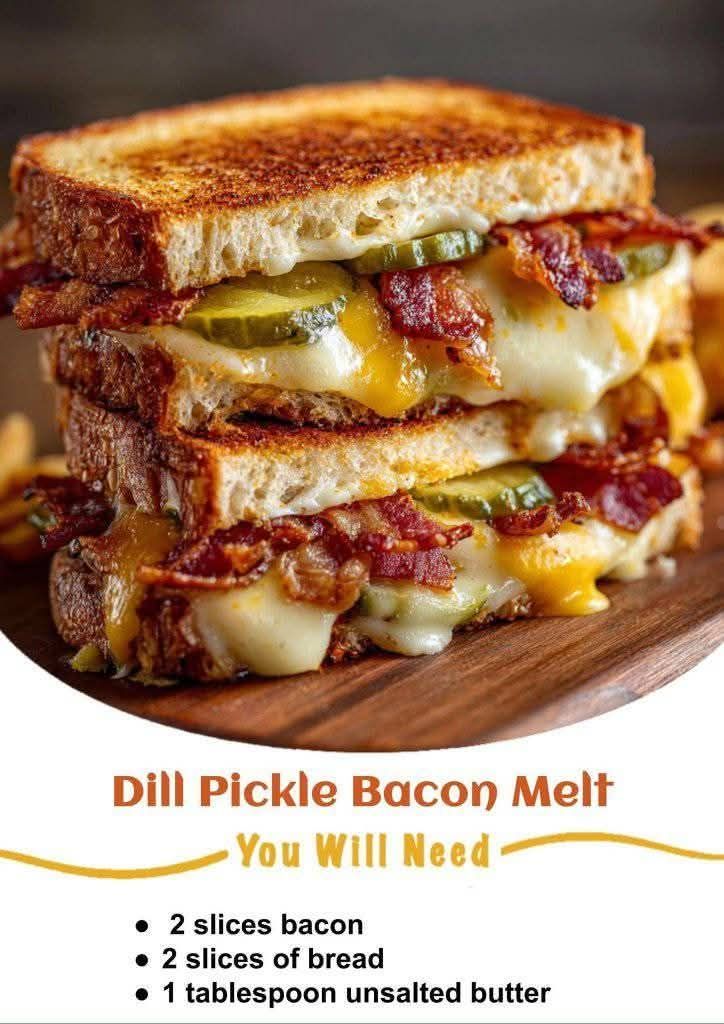 Here’s your complete and irresistible recipe for a Dill Pickle Bacon Melt — a crispy, cheesy, tangy grilled sandwich that’s perfect for lunch, dinner, or a comfort-food craving anytime. 🥓🧀🥒