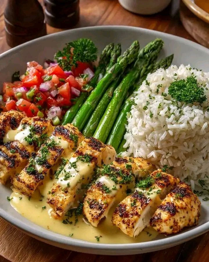 Golden grilled chicken paired with lemony butter sauce, tender asparagus, and aromatic herb rice. This complete plate is fresh, satisfying, and perfect for spring or summer evenings.