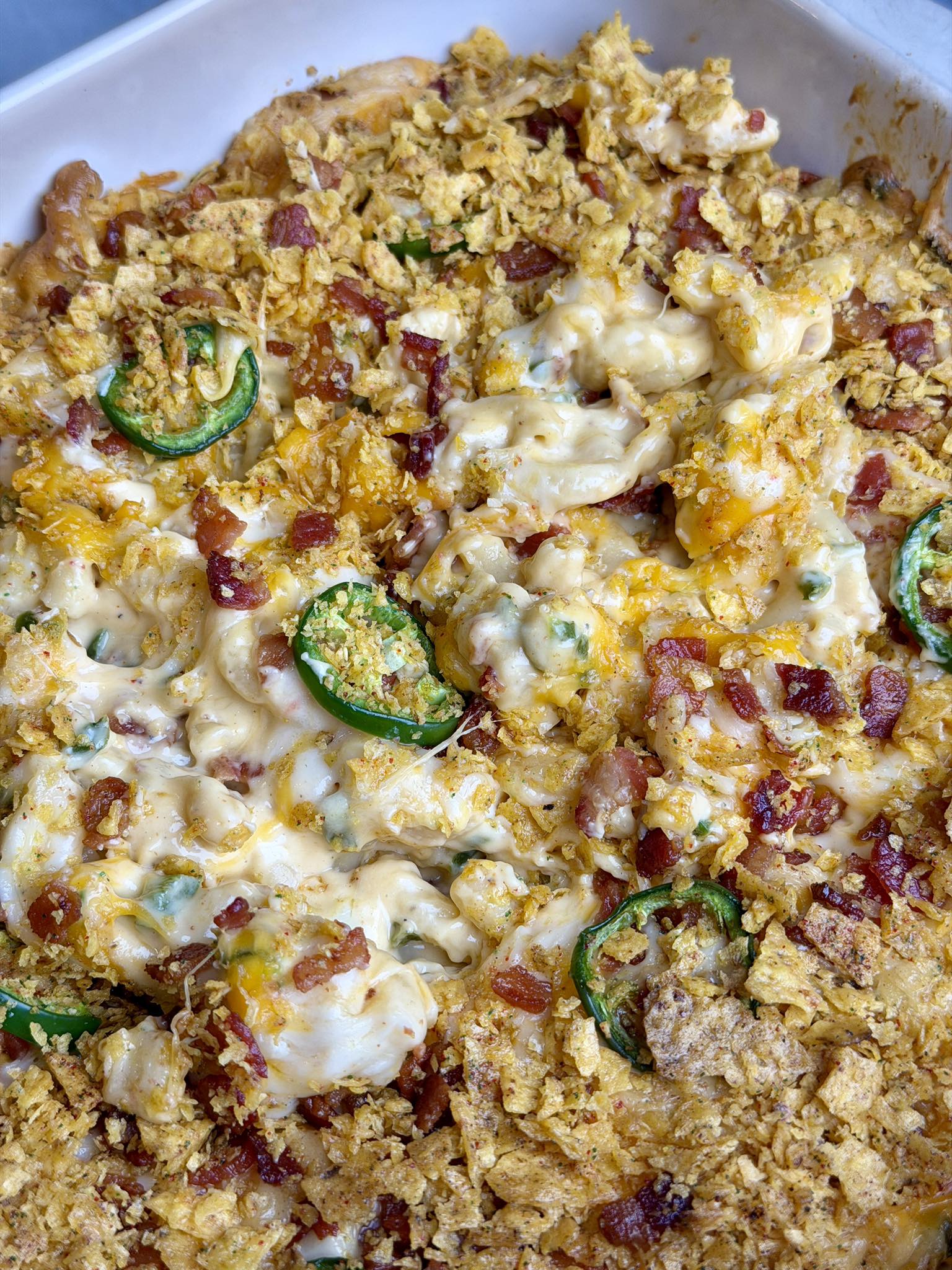 Jalapeno Popper Mac and Cheese is the upgrade to any side dish. Smoky and creamy cheese topped with bacon, jalapeños and crunchy Doritos.