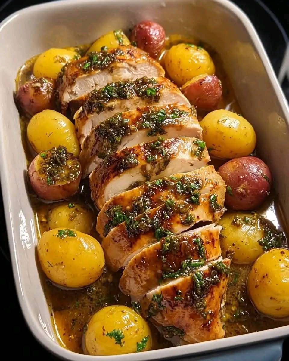 Juicy Herb-Roasted Chicken Breast with Baby Potatoes โ perfectly golden, tender chicken roasted with buttery baby potatoes and fresh herbs. This one-pan meal delivers incredible flavor, easy cleanup, and a hearty, comforting dinner that tastes like a Sunday roast any day of the week. ๐ฟ๐๐ฅ