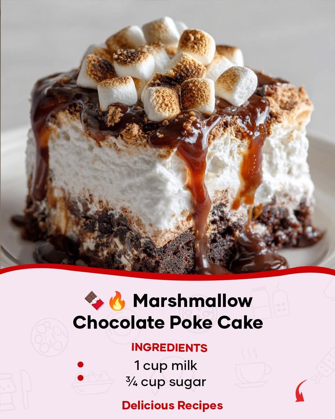 Soft, rich, and filled with gooey marshmallow cream — this dessert is melt‑in‑your‑mouth delicious. A tender cocoa cake is baked until just set, poked while warm so the marshmallow can seep into every bite, then finished with a billowy whipped topping and a smooth chocolate drizzle. Simple ingredients and a few careful cues deliver bakery‑style results at home.