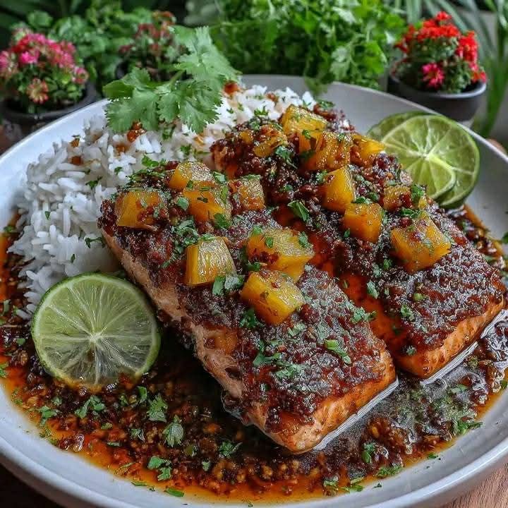 This Pineapple Ginger Glazed Salmon is a vibrant, tropical-inspired dish that combines the rich flavor of pan-seared salmon with a sweet and tangy glaze made from pineapple, honey, soy sauce, and fresh ginger. Each fillet is glazed to glossy perfection, creating a beautiful caramelized finish and irresistible aroma. Paired with jasmine or coconut rice, it’s an elegant yet easy meal that’s bursting with freshness and flavor.