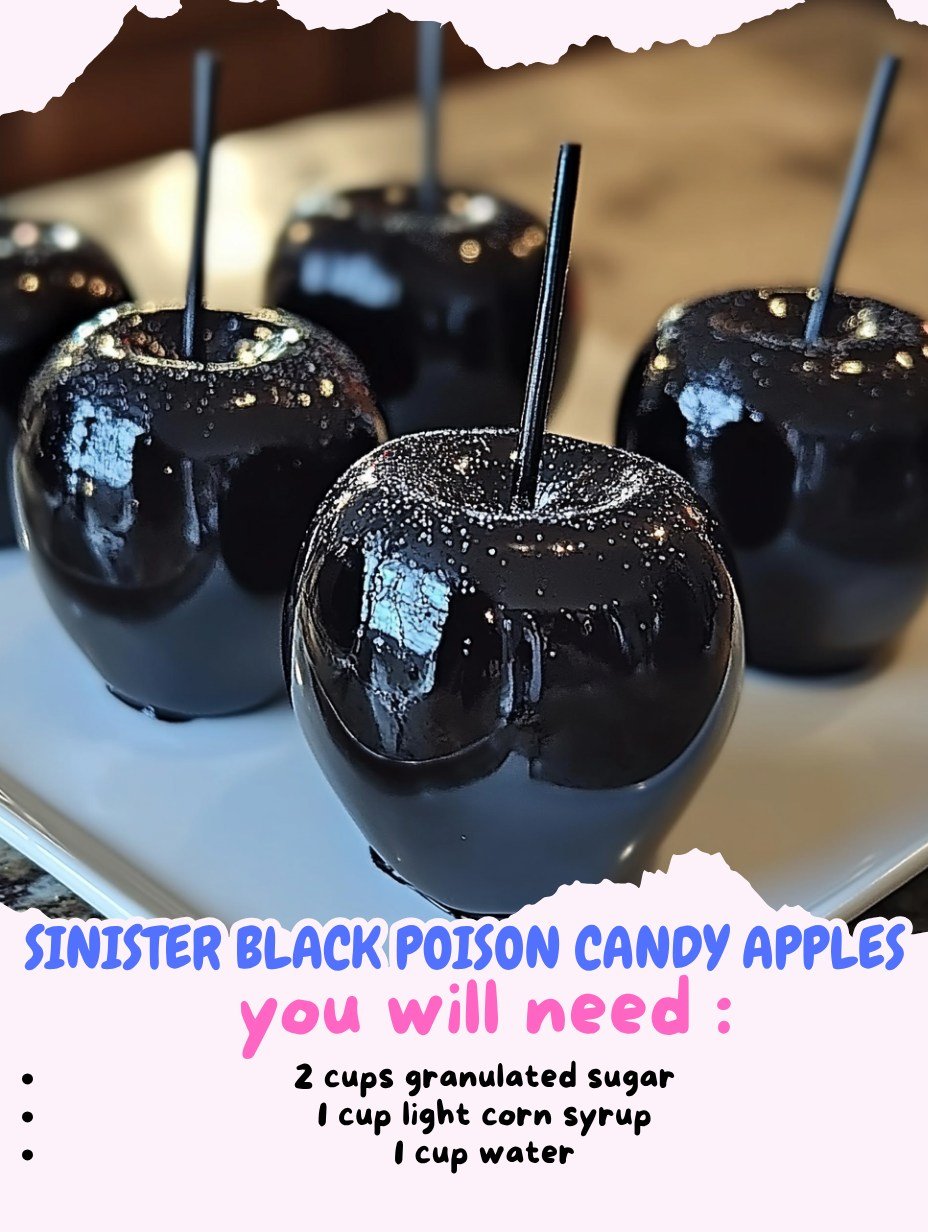 Sinister Black Poison Candy Apples are a hauntingly beautiful Halloween dessert that will cast a spell on your guests. With a glossy, jet-black candy shell and a tart apple core, these apples are the perfect combination of eerie elegance and crisp sweetness. Great for parties, spooky-themed treats, or a devilish DIY gift!