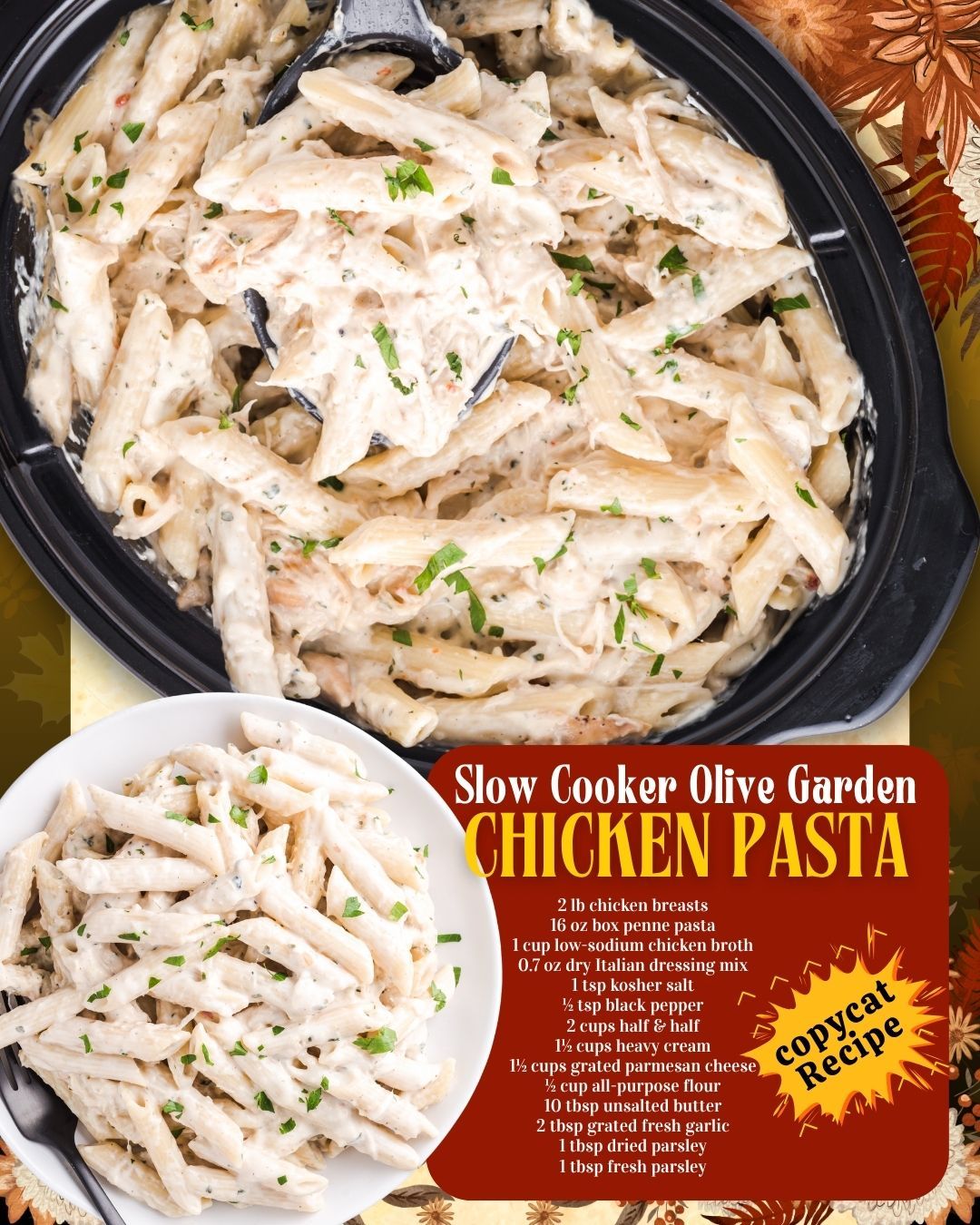 This Slow Cooker Olive Garden Chicken Pasta is a rich, creamy, and comforting pasta dish inspired by the restaurant favorite — made right at home! With tender, slow-cooked chicken in a velvety Parmesan garlic sauce, tossed with penne pasta, this recipe is perfect for busy weeknights or cozy family dinners.