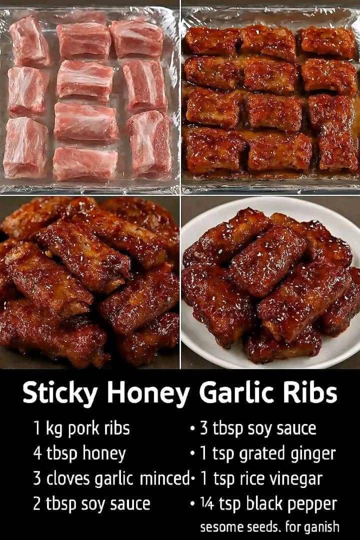 These Sticky Honey Garlic Ribs 🥩 are sweet, savory, and fall-off-the-bone tender. Glazed with honey, garlic, and soy sauce, they’re perfect for ftour, dinner parties, or indulgent weekends 🍯🧄🌿.