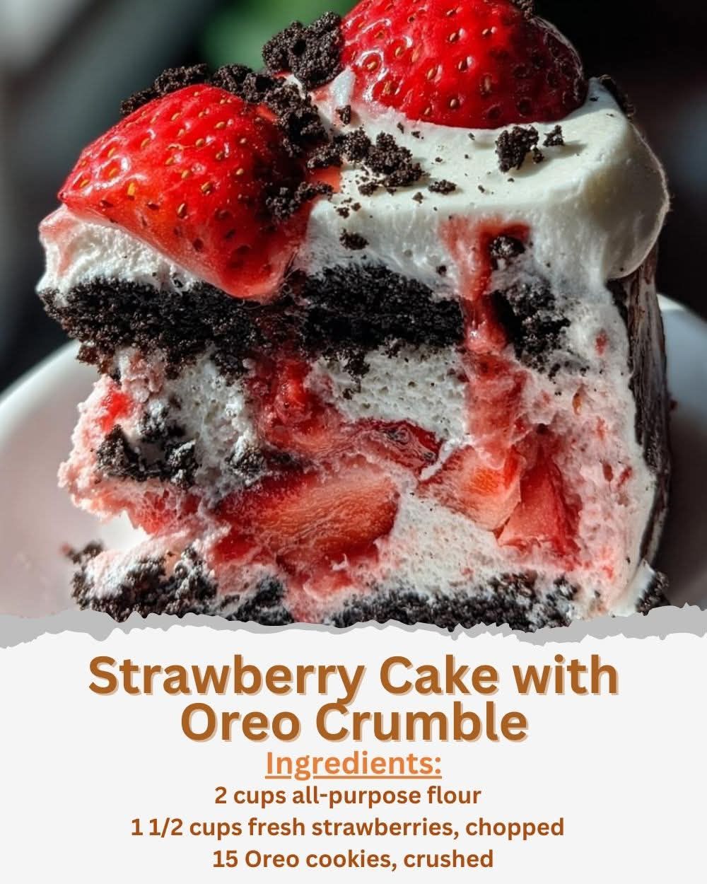This Strawberry Cake with Oreo Crumble layers soft, tender strawberry-studded cake beneath a billowy whipped cream topping and a generous blanket of crushed Oreo cookies. The batter uses buttermilk for extra moisture and lift, while fresh strawberries bring natural sweetness and pockets of juicy flavor throughout. Once baked and cooled, the cake becomes the perfect base for light whipped cream and the satisfying crunch of Oreo crumbs, creating a contrast of textures that feels both nostalgic and refreshing. Served chilled or at room temperature, it’s a crowd-pleasing dessert ideal for gatherings, celebrations, or a simple weekend treat.