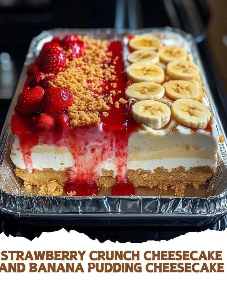 This layered Strawberry Crunch Banana Pudding Cheesecake is a visually striking and flavor-packed dessert that combines a buttery cookie crust, a creamy baked cheesecake base, a fruity strawberry crunch layer, and a soft banana pudding topping. Each layer adds its own distinct texture and flavor, creating a rich and indulgent dessert that is perfect for gatherings, celebrations, or any occasion where you want to serve an impressive homemade treat. The contrast between the tangy cheesecake, sweet strawberries, and smooth banana pudding makes every bite balanced and satisfying.