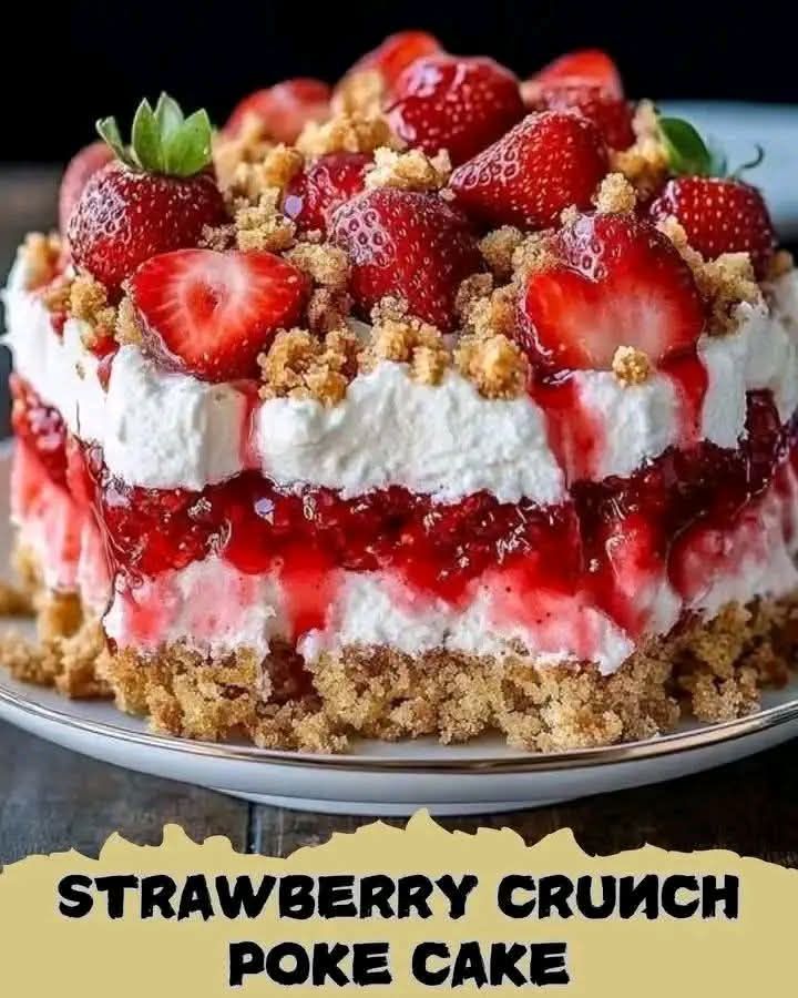 This Strawberry Crunch Poke Cake is a nostalgic dessert inspired by classic strawberry shortcake ice cream bars! It starts with a fluffy white cake soaked in sweet strawberry gelatin, layered with a rich cream cheese whipped topping, and finished with a buttery strawberry-Oreo crunch topping. It’s a crowd-pleasing, make-ahead treat that’s perfect for birthdays, potlucks, or summer parties! 🍰✨