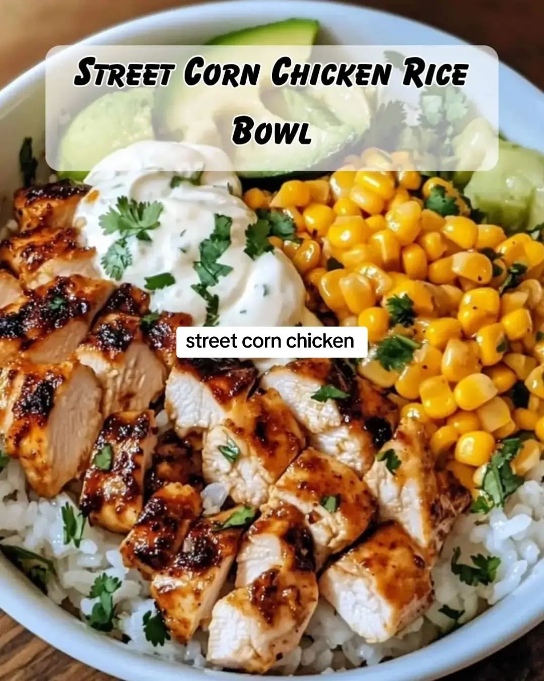 This Street Corn Chicken Rice Bowl combines juicy spiced chicken, creamy elote-style sauce, and bright, crunchy corn salsa over a bed of fluffy white rice. A fast and flavorful meal perfect for weeknights!