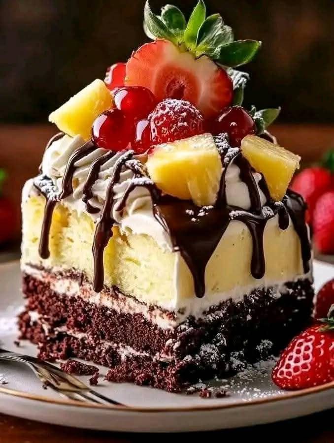 This Triple-Layer Ice Cream Cake is a tropical-choco dream come true! With a crunchy chocolate cookie crust, creamy layers of chocolate, strawberry, and pineapple ice cream, and a glossy ganache topping, it’s a refreshing showstopper that tastes as heavenly as it looks. Perfect for birthdays, summer parties, or any day you crave a slice of frozen happiness. 🍰🍫🍓🍍