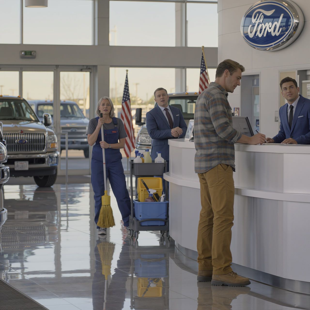 He changed. Old jeans with a threadbare knee. A blue flannel soft from a hundred washes. Work boots scuffed white at the toe. A battered local‑league baseball cap pulled low. In the mirror he saw Jim Wright—a tired man who worked with his hands. He drove in under the red, white, and blue pennants. The lot shone. The glass looked like a promise. The floor felt like a test he hadn’t studied for.